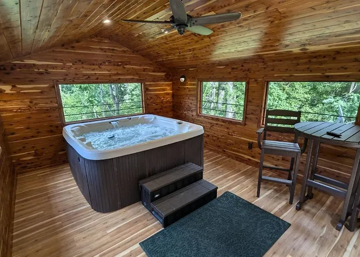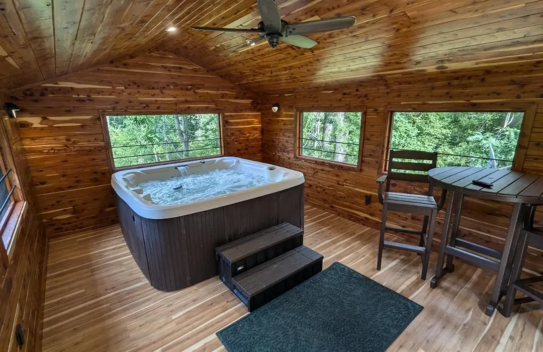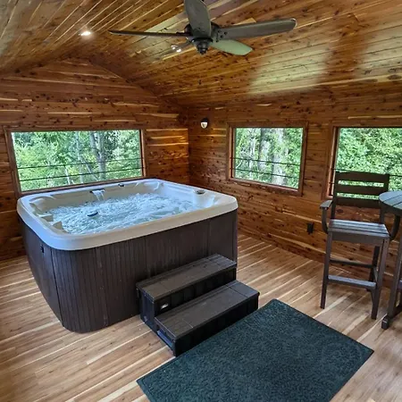 Red Roof Mountain Cabin With Starlink Internet! comes with a bathroom with a separate toilet, a hot tub, and a shower. There are also a hair dryer and bath sheets.